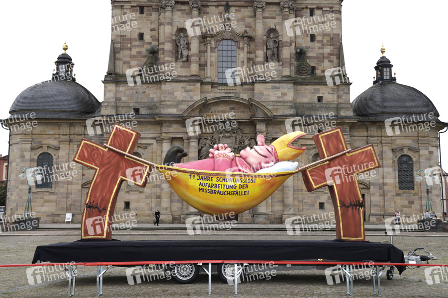 Der Hängemattenbischof bei einer Protestaktion der Giordano-Bruno-Stiftung und der Betroffeneninitiative-Hildesheim bei der Herbst-Vollversammlung der Deutschen Bischofskonferenz auf dem Vorplatz des Doms zu Fulda. Fulda 20.09.2021