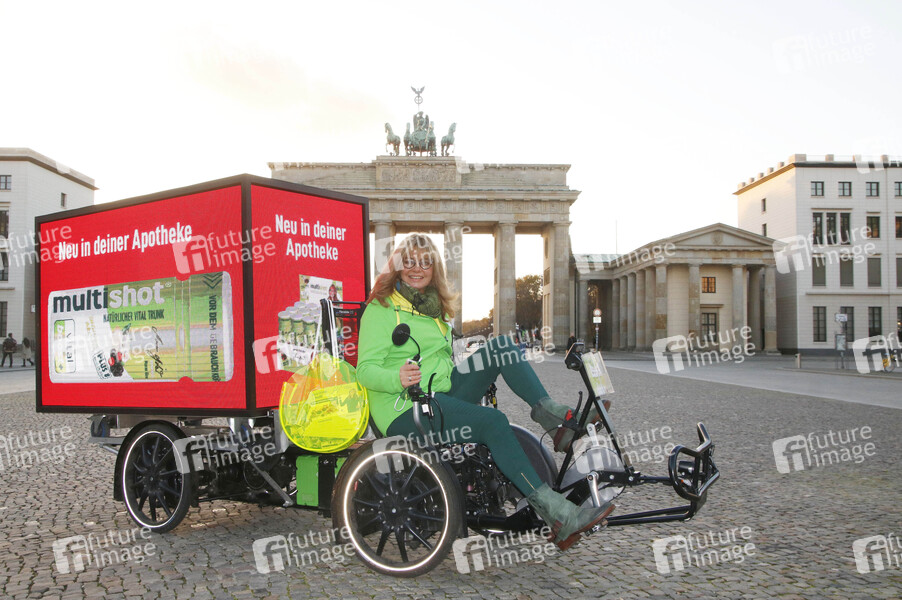 Maren Gilzer bei der Präsentation ihres gesundheitsfördernden Superfoodsaftes von multishot am Brandenburger Tor. Berlin, 20.11.2020