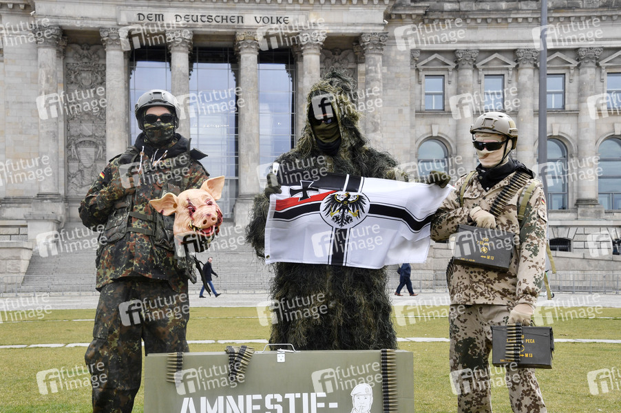 Protestaktion zur Sondersitzung des Verteidigungsausschusses des Bundestags zu den Vorfällen bei den Kommando Spezialkräften (KSK) der Bundeswehr vor dem Reichstagsgebäude. Bei der Aktion führen drei als KSK-Soldaten in voller Tarnmontur gekleidete Aktivisten vor der Kulisse des Bundestagsgebäudes die letzten Skandale der Bundeswehr-Einheit vor: Einer hält einen (künstlichen) blutverschmierten Schweinekopf in Händen, ein anderer zeigt rechtsextreme Symbolik und der dritte trägt Munitionskisten und Munition. Damit sollen die skandalträchtigen 'Partys' einiger KSK-Soldaten (bei denen reale Schweineköpfe verwendet wurden), die rechtsextremen Vorfälle in der Einheit sowie den Munitionsklau symbolisiert werden. Weiterhin wird ein Transparent mit der Aufschrift 'Kommando Spezialkräfte Auflösen' mit dem durchgestrichenen Wappen der Einheit gezeigt. Berlin, 12.04.2021
