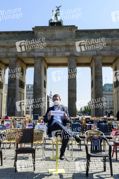 Mit leeren Stühlen vor dem Brandenburger Tor in Berlin protestieren Gastronomen, Veranstalter und Hoteliers gegen die unzureichende Corona-Hilfe. Sie fordern Aufstockung des Kurzarbeitergeldes auf 90%, 7% Mehrwertsteuer, Erweiterung des Bundeszuschusses 'Soforthilfe' für Unternehmen mit mehr als 10 Mitarbeitern und eine klare Exit-Strategie. Berlin, 24.04.2020