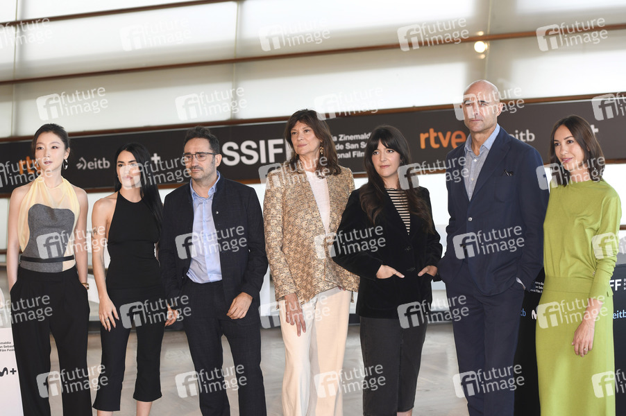 Zhou Dongyu, Lali Espósito, Juan Antonio Bayona, Anne-Dominique Toussaint, Laura Carreira, Mark Strong und Gia Coppola beim Photocall mit der offiziellen Jury auf dem 73. Internationalen Filmfestival San Sebastian / Festival Internacional de Cine de San Sebastián im Kursaal. San Sebastian, 22.09.2025