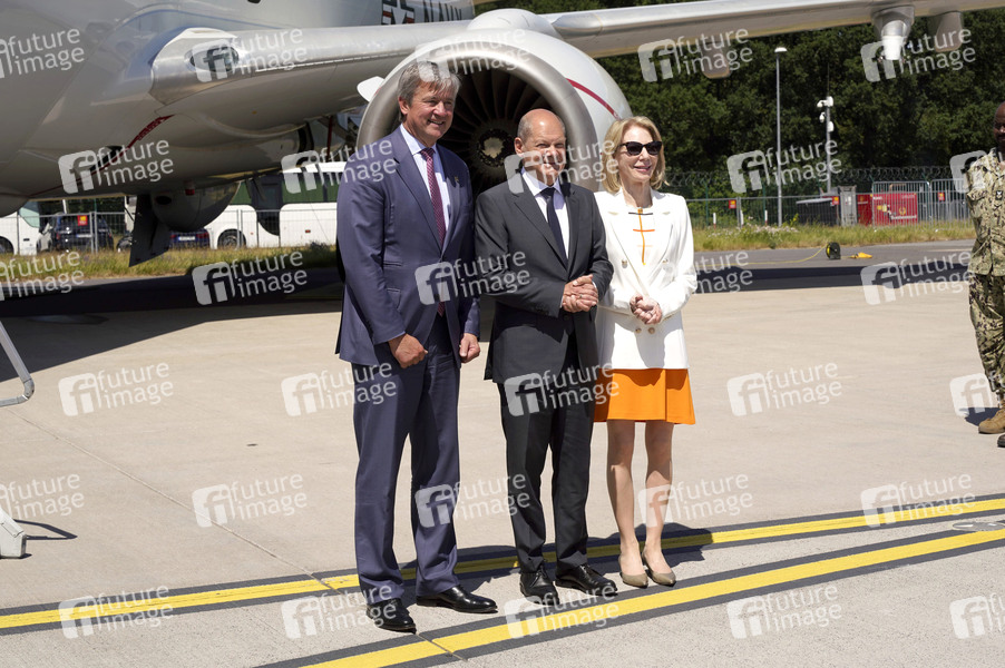 Michael Haidinger, Olaf Scholz und Amy Gutmann bei der ILA-Eröffnung mit anschließendem Rundgang auf dem ILA-Gelände am Flughafen BER Berlin-Brandenburg. Berlin, 22.06.2022