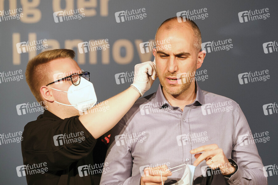 Belit Onay mit Tontechniker beim Wirtschaftsempfang 2021 der Landeshauptstadt Hannover, der coronabedingt digital stattfindet, mit dem Thema 'Umweltfreundliche Mobilität und Wirtschaft - ein Widerspruch?' in der Eilenriedhalle. Hannover, 19.04.2021