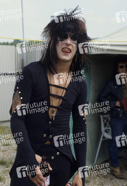 Nikki Sixx von Mötley Crüe live auf dem Monsters of Rock Festival 1984 im Donington Park. Donington, 18.08.1984
