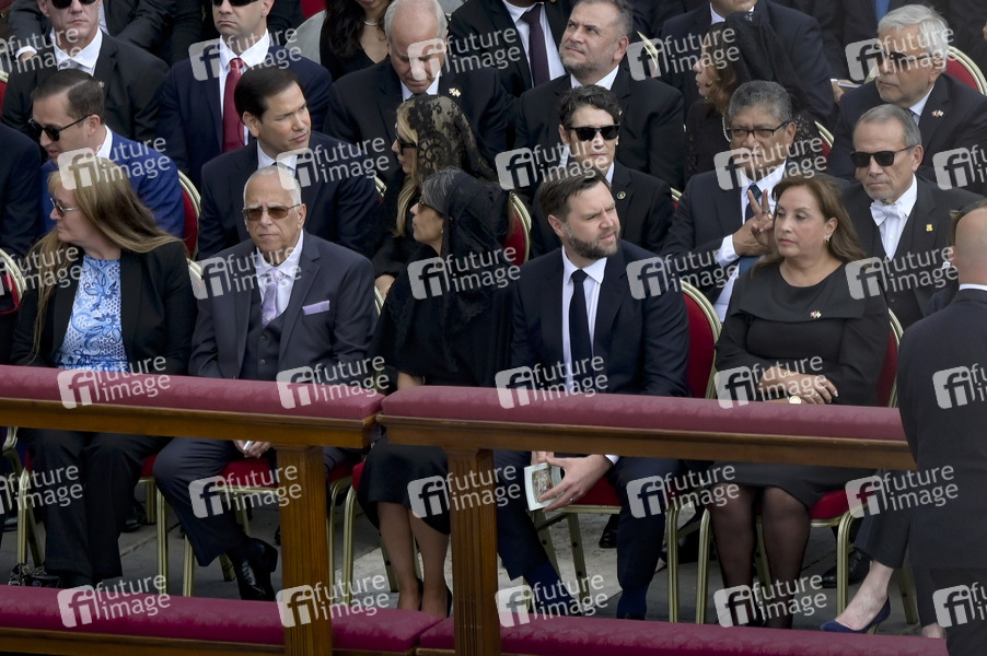 Usha Vance, JD Vance und Dina Ercilia Boluarte Zegarra bei der Amtseinführung von Papst Leo XIV. auf dem Petersplatz. Vatikanstadt, 18.05.2025