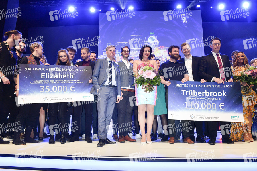 Dorothee Bär und Andreas Scheuer mit den Gewinnern bei der Verleihung des Deutschen Computerspielpreises 2019 im Admiralspalast. Berlin, 09.04.2019