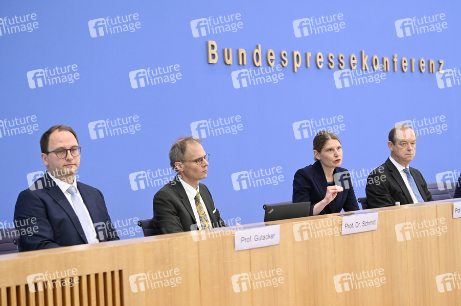 Nils Gutacker, Jochen Schmitt, Leonie Sundmacher und Michael Hallek bei der Bundespressekonferenz Vorstellung Gutachten: 'Was muss die neue Bundesregierung unternehmen, damit innovative Arzneimittel weiter allen Patienten zur Verfügung stehen?' im Haus der Bundespressekonferenz. Berlin, 22.05.2025