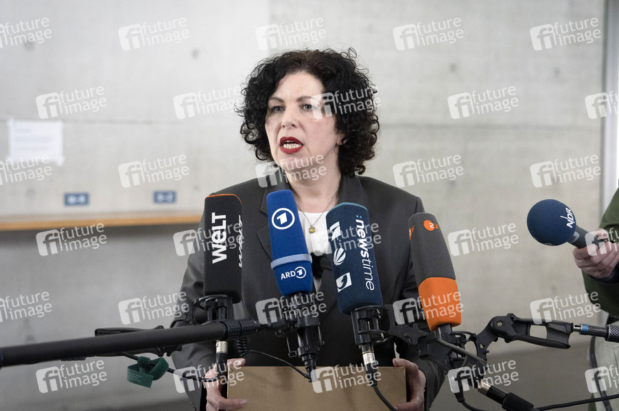 Amira Mohamed Ali übergibt Einspruch vom BSW gegen das amtliche Endergebnis der Bundestagswahl 2025 beim Wahlprüfungsausschuss im Paul-Löbe-Haus. Berlin, 23.04.2025