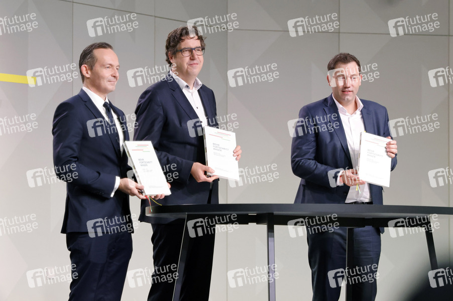 Volker Wissing, Michael Kellner und Lars Klingbeil beim Pressetermin zur Unterzeichnung des Koalitionsvertrages zwischen SPD, Bündnis 90/Die Grünen und FDP im Futurium. Berlin, 07.12.2021