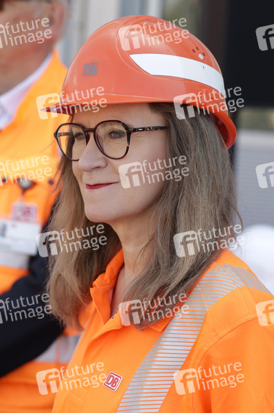 Sigrid Nikutta bei der Vorstellung der ersten Güterzuglokomotive, die für den automatisierten Streckenbetrieb umgerüstet wurde im DB Cargo-Werk Köln-Gremberg. Köln, 04.07.2025