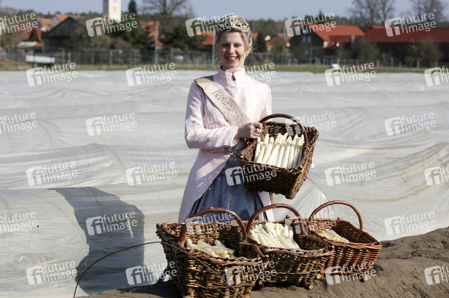 Spargelkönigin Gina Luise Schrey beim traditionellen Spargelanstich zur Eröffnung der Spargelsaison 2020 im Beelitzer Ortsteil Schäpe. Beelitz, 07.04.2020
