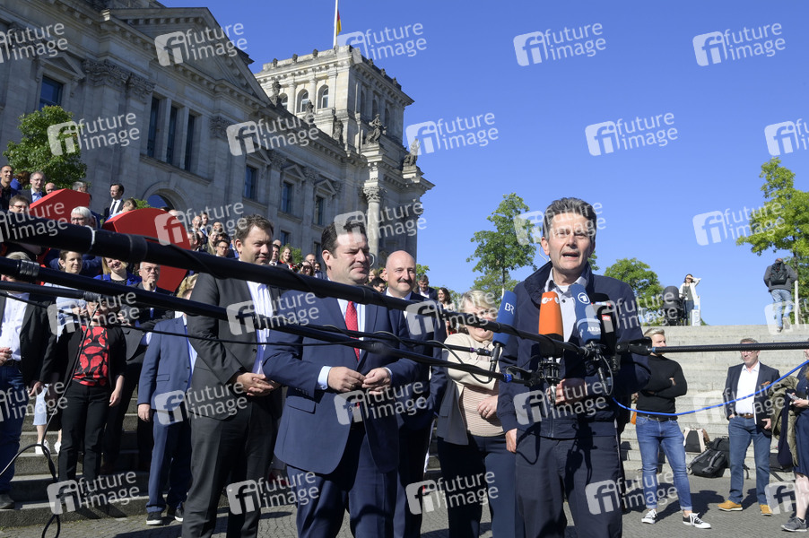 Lars Klingbeil, Hubertus Heil und Rolf Mützenich mit Gewerkschaftern und SPD-Mitgliedern bei einer Kundgebung zur Befürwortung des 12-Euro-Mindestlohns vor dem Reichstagsgebäude. Heute wird im Bundestag über den 12-Euro-Mindestlohn ab Oktober 2022 abgestimmt. Berlin, 03.06.2022
