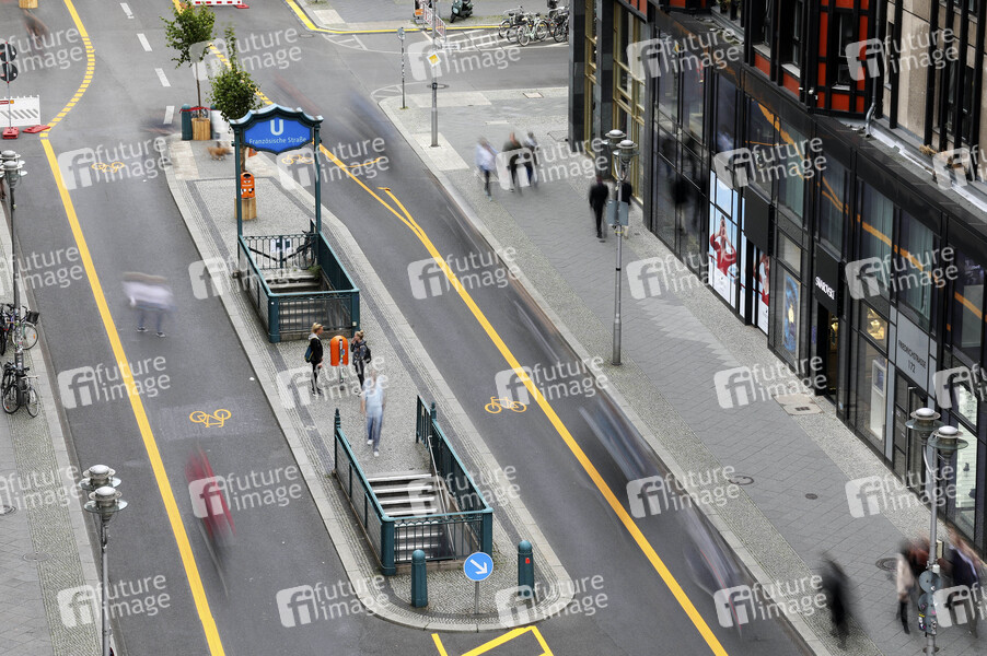 Bis Januar 2021 dürfen zwischen Französischer Straße und Leipziger Straße keine Autos auf der Friedrichstraße fahren - aber Radfahrer. Sie bekommen eine vier Meter breite Spur, die noch grün unterlegt werden soll, sie soll auch als Gasse für Rettungswagen dienen. Es gilt das Tempolimit 20 für Radfahrer. Das Projekt ist Teil des mehrmonatigen Tests 'Flaniermeile Friedrichstraße'. Berlin, 01.09.2020
