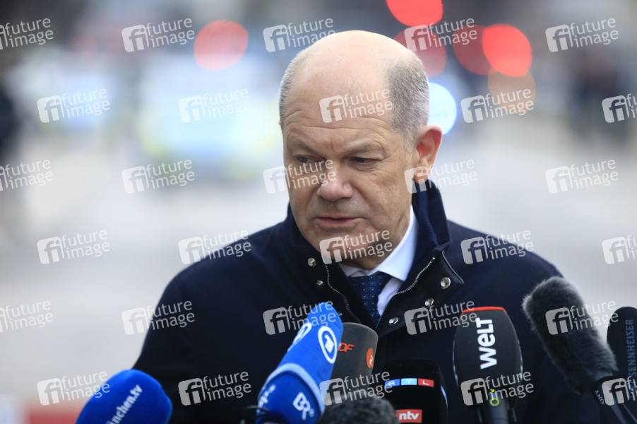 Olaf Scholz beim Pressestatement am Ort des mutmaßlichen Anschlags vom 13. Februar. München, 15.02.2025