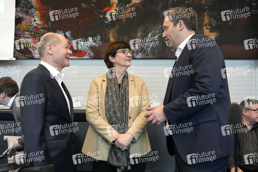 Olaf Scholz, Saskia Esken und Lars Klingbeil bei der Fraktionssitzung der SPD-Bundestagsfraktion im Reichstagsgebäude. Berlin, 12.03.2024