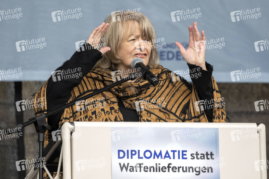 Alice Schwarzer auf der umstrittenen Friedensdemo und Kundgebung für Verhandlungen mit Russland statt Waffenlieferungen für die Ukraine am Brandenburger Tor. Dazu aufgerufen haben die Linken-Politikerin Sahra Wagenknecht und die Frauenrechtlerin Alice Schwarzer. Berlin, 25.02.2023