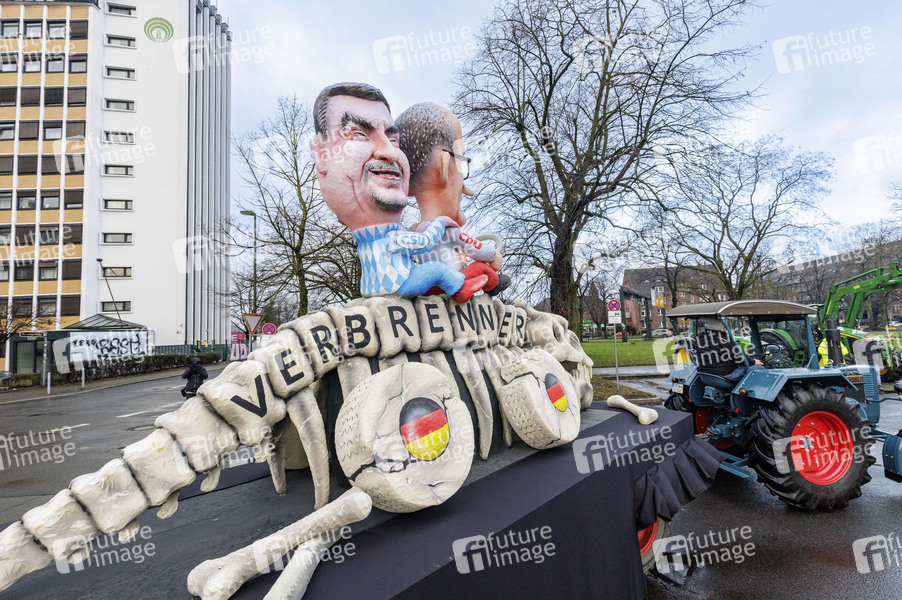 Motto-Wagen des Wagenbau-Künstlers Jacques Tilly bei der Aufstellung des Rosenmontag-Zuges an der Wagenbauhalle. Düsseldorf, 16.02.2026