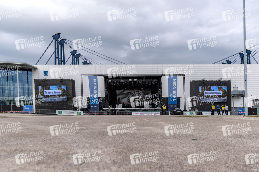 Die Bühne bei der Eröffnung der Autokonzert-Reihe mit Karat an der Messe. Erfurt, 20.05.2020