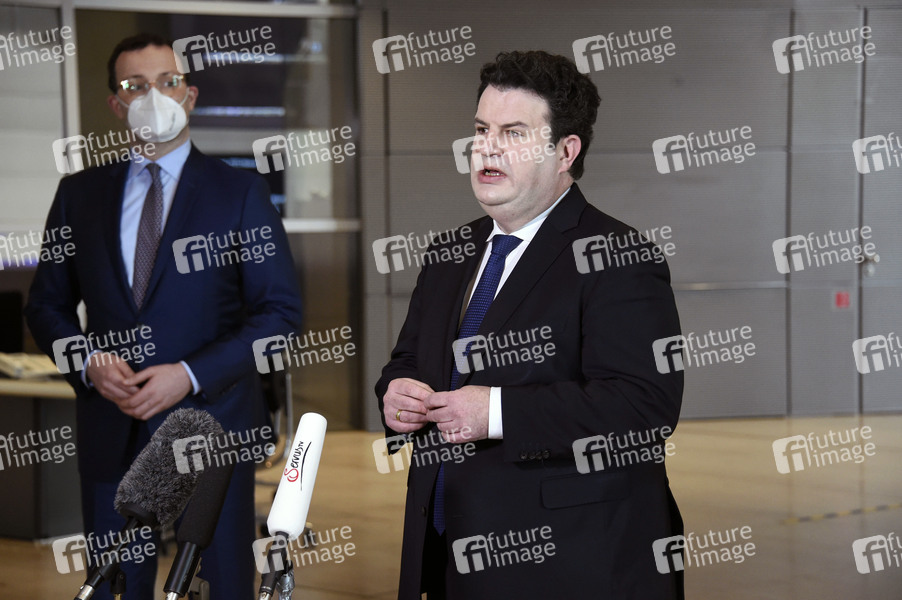 Gesundheitsminister Jens Spahn und Arbeitsminister Hubertus Heil beim Pressestatement zur Verteilung von FFP2-Masken an Hartz-IV-Empfänger am Rande der 206. Sitzung des Deutschen Bundestages in der 'Westlobby', dem Aufenthaltsbereich vor dem Plenarsaal auf der Westseite im Reichstagsgebäude. Berlin, 28.01.2021