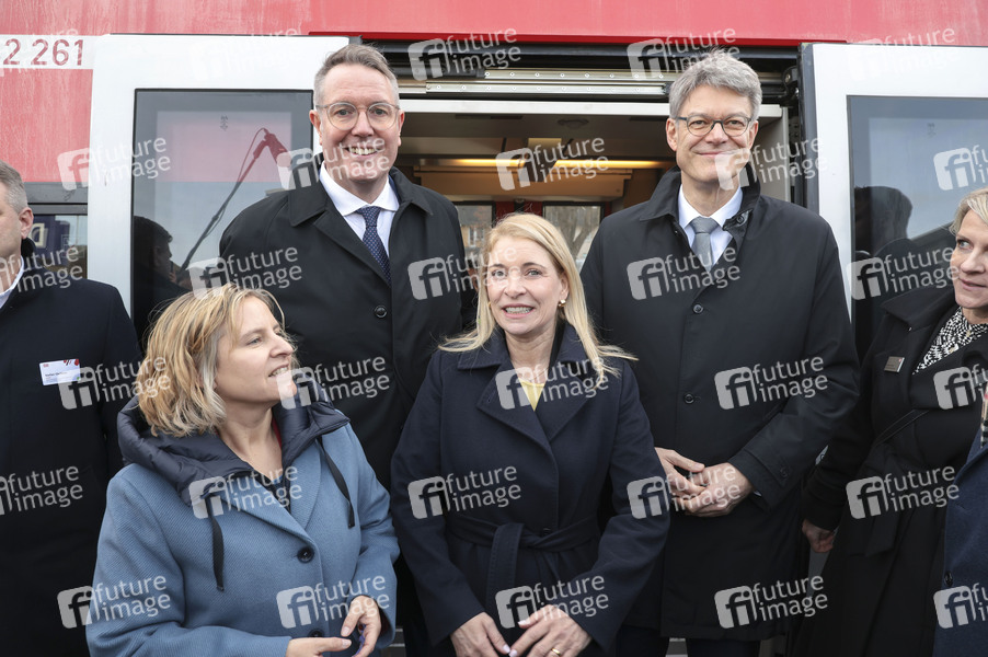 Katrin Eder, Alexander Schweitzer, Evelyn Palla, Patrick Schnieder bei der Inbetriebnahme der neuen Ahrtalbahn mit Sonderfahrt von Dernau nach Altenahr. Dernau, 12.12.2025