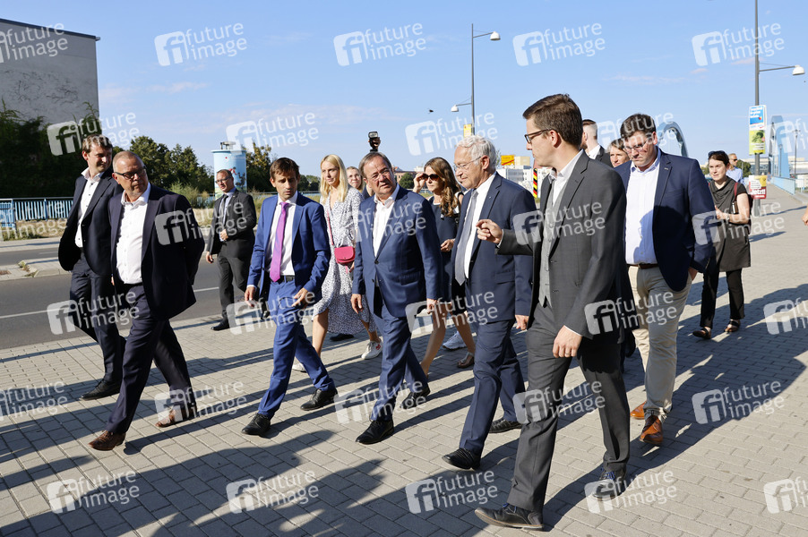Michael Stübgen, Daniel Rosentreter, Armin Laschet, Martin Patzelt, Claus Junghanns und Michael Möckel beim Besuch von Kanzlerkandidat Armin Laschet in Frankfurt (Oder) im Rahmen seiner Wahlkampftour. Frankfurt (Oder), 12.08.2021