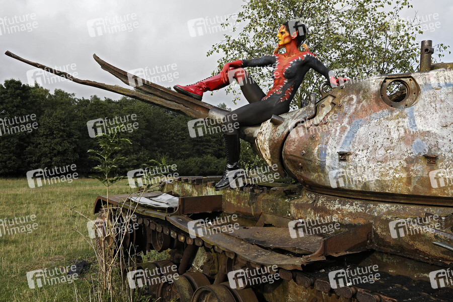 Farbkörper, Cosplay, Cosplayer, Make-up, Latexappliaktionen, Latexteile, Maskenbildnerei, Bodypainting, Body-Painting, Erotik, Frau, Mädchen, nackt, Akt, weiblich, Körperkunst, Körperfarben, Farbe, Bemalung, Kunst, Malerei, draußen, Science Fiction, Sci-Fi, SciFi, Fantastic, Dystopie, Endzeit, Panzer, Krieg, Höllenwesen, Teufel, Dark Fantasy, Kriegerin, Dämon, M47 Patton Kampfpanzer, body painting, erotic, woman, girl, nude, female, body art, colors, outdoors, dystopia, tank, war, hell being, warrior, demon