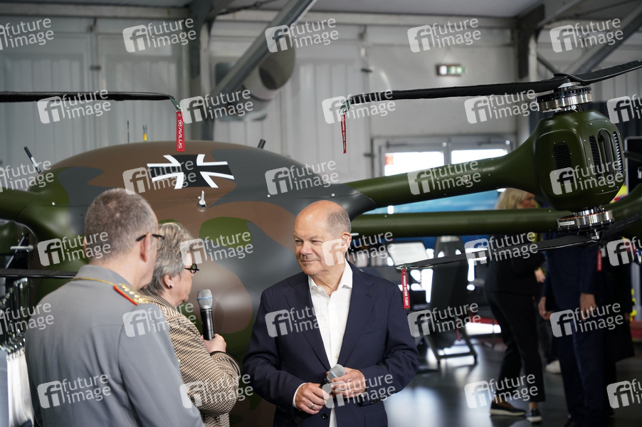Olaf Scholz vor einer Militär-Drohne beim Eröffnungsrundgang der ILA Berlin auf dem ILA-Gelände am Flughafen BER Berlin-Brandenburg. Berlin, 05.06.2024