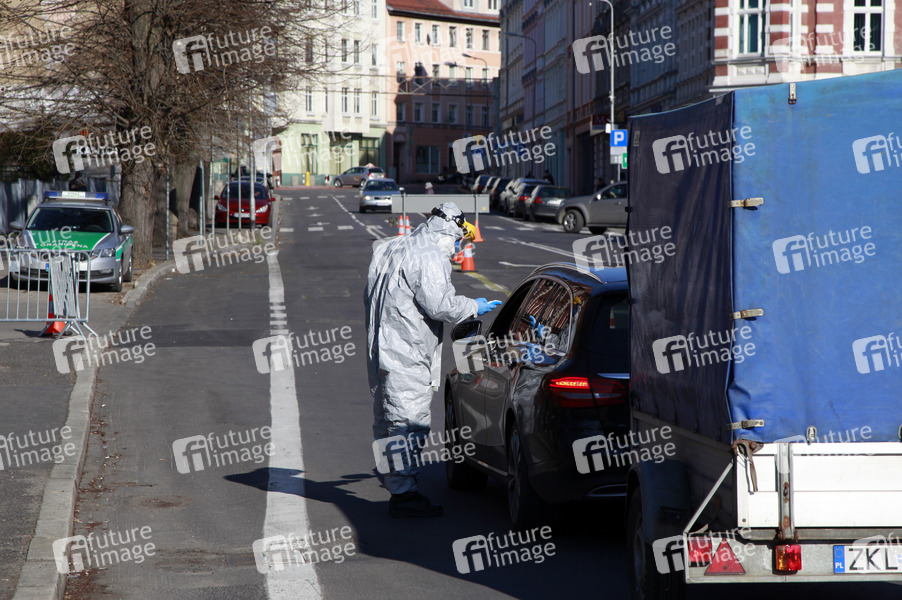 Grenzverkehr, Grenze, EU, Epidemie, Pandemie, Corona, Virus, Infektion, Lungenkrankheit, Schutzmaske, Mundschutz, Schutzanzug, Polen, SARS-CoV-2, Covid-19, Schutzmaßnahmen, Grenzübergang, Corona-Angst, Ansteckungsangst, Seuche, Corona-Test, Corona-Tests, Coronatest, Coronatests, anstecken, Corona-Krise, Vorbeugung, Prävention, schützen, Schutz, Papst-Johannes-Paul-II.-Brücke