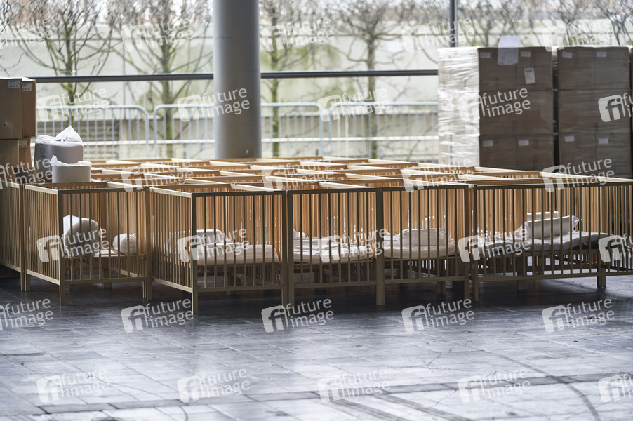 Kinderbetten - Zeltdörfer-Unterkünfte für ukrainische Kriegsflüchtlinge in der Halle 27 auf dem Messegelände, inklusive Wasch- und Duschmöglichkeiten, errichtet von der Feuerwehr Hannover. Die spätere Versorgung erfolgt durch das DRK. Hannover, 06.03.2022