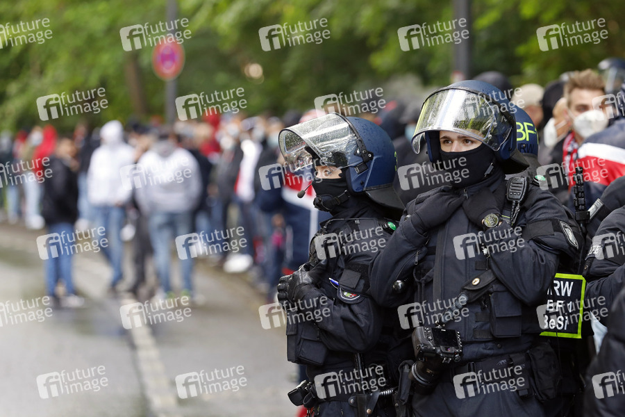 Die Polizei ist mit einem Großaufgebot vor Ort, als einige hundert Fans des 1. FC Köln das Relegationsspiel gegen Holstein Kiel (0:1) auf den Jahnwiesen in unmittelbarer Nähe zum Rhein-Energie-Stadion verfolgen und den Bus der Mannschaft mit Rauchbomben begrüßen. Trotz der Heimniederlage des 1. FC Köln kommt es zu keinen Ausschreitungen. Es ist seit langem in der Diskussion, für die Kosten für Polizeieinsätze in der Bundesliga stärker die Vereine zur Kasse zu bitten. Köln, 26.05.2021