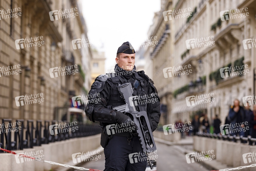 Sicherheitskräfte der französischen Gendarmerie bewachen wichtige Straßen und errichten Checkpoints rund um den Champ Elysees. Paris, 23.03.2019