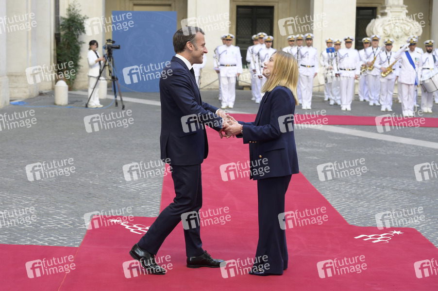 Emmanuel Macron und Giorgia Meloni beim Empfang des Staatspräsidenten der Französischen Republik mit militärischen Ehren im Palazzo Chigi. Rom, 03.06.2025
