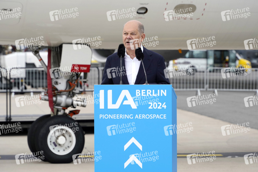 Olaf Scholz vor einem Airbus A321 beim Eröffnungsrundgang der ILA Berlin auf dem ILA-Gelände am Flughafen BER Berlin-Brandenburg. Berlin, 05.06.2024
