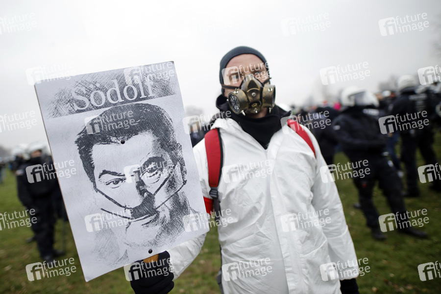 Ein Demonstrant posiert mit einem im Stile Adolf Hitler verfremdeten Konterfei von Markus Söder, betitelt als 'Södolf', auf der Querdenken-Demo im Rheinpark Golzheim. Düsseldorf, 06.12.2020