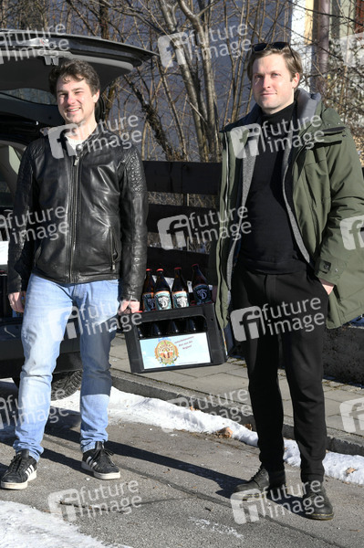 Michi Schauer und Sepp Bastl von der Band Zwoa Bier bei der Auslieferung ihres selbstgebrauten Bieres 'Helles D' von Stadlbräu Oberhaching zum Valentinstag. Die Musiker haben die coronabedingte freie Zeit zum Bierbrauen genutzt. Während andere Bands Masken mit Bandlogo hergestellt haben, hat die Band ein eigenes Bier mit dem Namen 'Helles D' bei Stadlbräu Oberhaching gebraut, dass sie nun am heutigen Valentinstag im Landkreis München und München (Ortsgrenze) im Sixpack ausliefern. Bestellt werden konnte im Voraus bei der Band. Die Resonanz war groß. Es war sogar eine Anfrage aus Mainz dabei gewesen. Ottobrunn, 14.02.2021