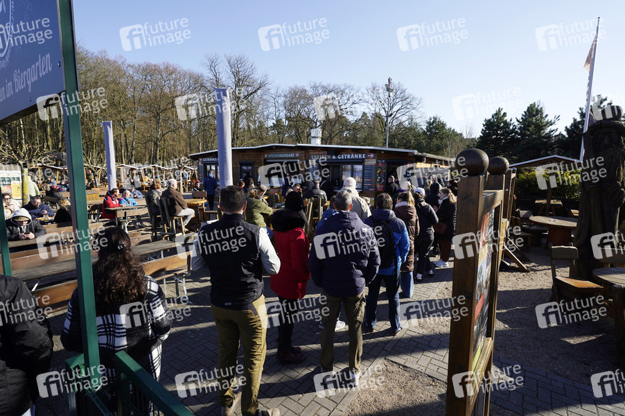 Viele Berliner nutzten das Frühlingswetter zu Ausflügen zu beliebten Ausflugszielen wie z.B. den Biergarten Rübezahl am Müggelsee. Der großzügige Biergarten im Naturschutzgebiet liegt mitten im Wald und von der Terrasse genießt man einen herrlichen Blick über den See. Berlin, 16.03.2025