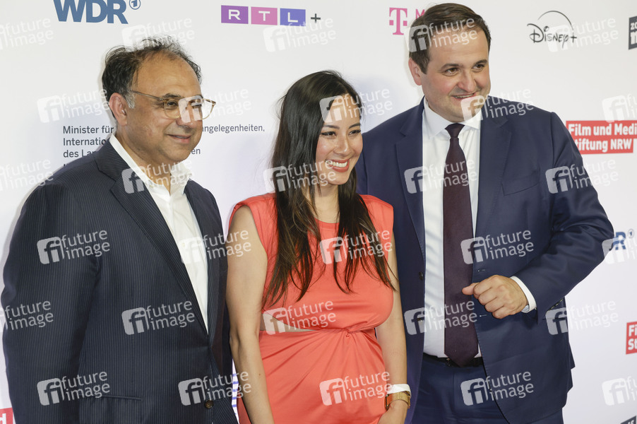 Walid Nakschbandi, Sophia Tran und Nathanael Liminski bei der Eröffnung des 11. Seriencamp Festival 2025 mit der Premiere der ARD/ORF Miniserie 'Hundertdreizehn' im Cinenova Kino. Köln, 03.06.2025