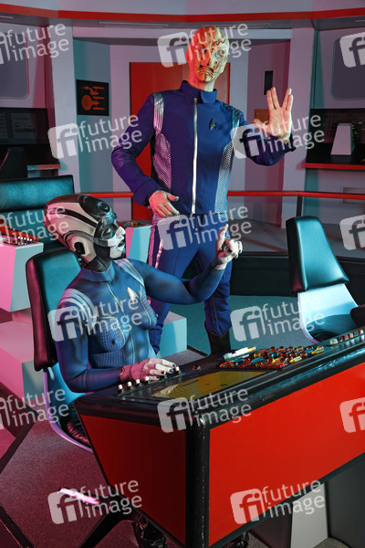 GEEK ART - Bodypainting meets SciFi, Fantasy and more: 'Star Trek Discovery' Photoshooting mit Model Barbara Wegener als Airiam und Enrico Lein als Saru auf der Brücke vom Raumschiff Enterprise im Filmwelt Center. Bad Münder, 18.04.2019 - Ein Projekt des Fotografen Tschiponnique Skupin und des Bodypainters und Transformakers Enrico Lein