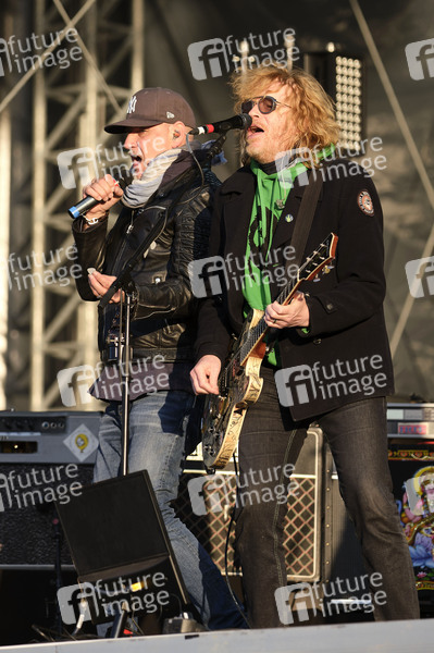 Kai Wingenfelder und Christof Stein-Schneider von Fury in the Slaughterhouse live beim Autokultur-Konzert auf dem Schützenplatz. Die Besucher verfolgen unter Berücksichtigung klarer Hygiene-Vorschriften während der Corona-Krise den Auftritt aus dem Auto. Hannover, 14.05.2020