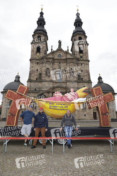 David Farago (Aktionsleiter der Giordano-Bruno-Stiftung), Maximilian Stellenhaus (Teammitglied der Giordano-Stiftung) und Jens Windel (Betroffeneninitiative-Hildesheim) bei einer Protestaktion der Giordano-Bruno-Stiftung und der Betroffeneninitiative-Hildesheim bei der Herbst-Vollversammlung der Deutschen Bischofskonferenz auf dem Vorplatz des Doms zu Fulda. Fulda 20.09.2021