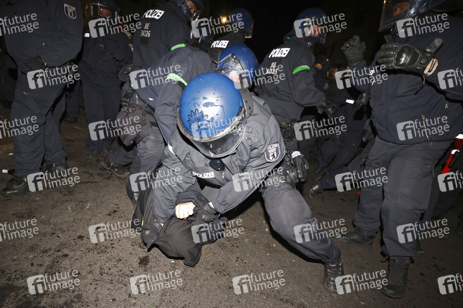 Bei einer Demo gegen die Räumung des linksautonomen Bauwagen-Camps 'Köpi' in Berlin-Kreuzberg ist es zu Ausschreitungen gekommen. Dabei wurden Polizisten mit Flaschen, Steinen und Feuerwerkskörpern beworfen. Unbekannte haben in der Reichenbergerstraße Scheiben mehrerer Autos zerschlagen, Verkehrsschilder in parkende Autos gerammt und Dixieklos umgeschubst. Laut Polizei waren 7.000 bis 8.000 Teilnehmer vor Ort. Berlin, 15.10.2021