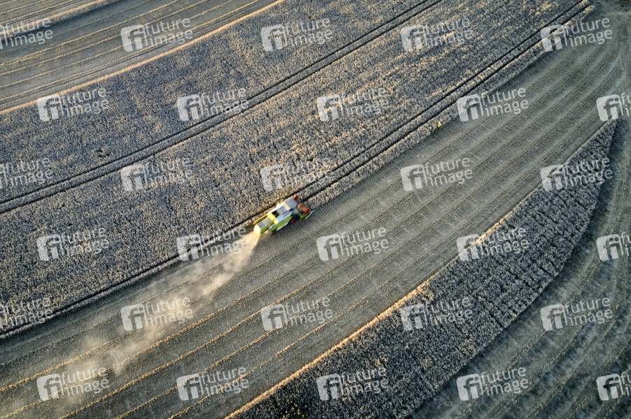 Luftbild, Luftaufnahme, Mähdrescher, Erntemaschine, Korn, Kornfeld, Vollkorn, Ähren, Halme, Feld, Landwirtschaft, Dürre, Trockenheit, Wasser, Regen, Grundwasser, Wasserknappheit, Grundwasserspiegel, Grundwasserpegel, Trockenphase, Ernte, Ernten, Getreide, Landwirte, Bauern, Acker, Äcker, Weizen, Gerste, Roggen, Wheat, Rye, Barley, Körner, Triticale, Anbau, Bio, Dünger, Agrar, Agrarwirtschaft, Erntewetter, Ernteausfall, Ernteausfälle, Futterkrise, Missernte, Futter, Saat, Saatgut, Anbau, Fruchtbarkeit, Bauern, Bauernverband, Symbolbild, Symbolfoto