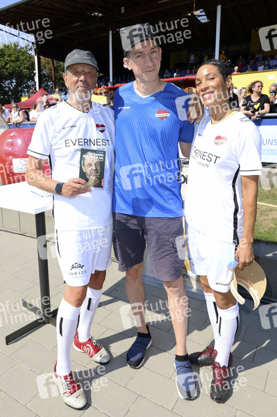 Rolf Fuhrmann, Steffen Hallaschka und Annabelle Mandeng beim Benefiz-Fußballspiel 'Kicken mit Herz' 2022 zu Gunsten des Herzzentrums des UKE im Stadium des SC Victoria. Hamburg, 04.09.2022