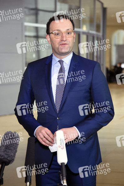 Gesundheitsminister Jens Spahn beim Pressestatement zur Verteilung von FFP2-Masken an Hartz-IV-Empfänger am Rande der 206. Sitzung des Deutschen Bundestages in der 'Westlobby', dem Aufenthaltsbereich vor dem Plenarsaal auf der Westseite im Reichstagsgebäude. Berlin, 28.01.2021