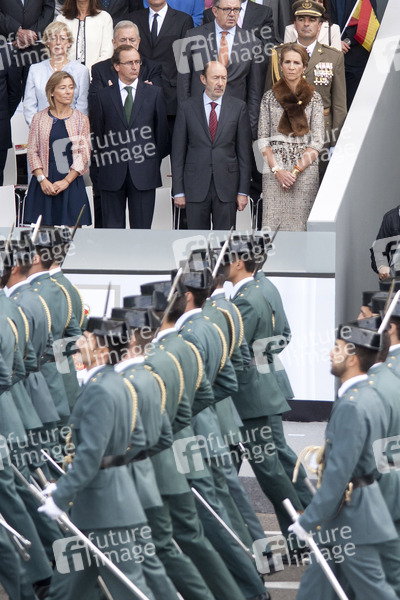 Die spanische Königsfamilie bei der Hommage an die Nationalflagge mit Militärparade am Palacio Real, Madrid
