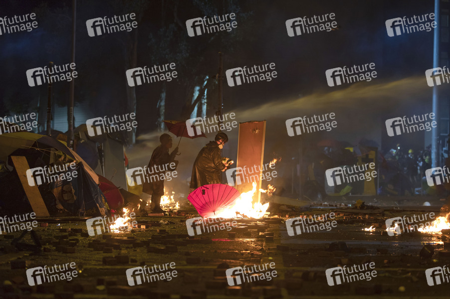 Sudenten wehren sich mit Molovecocktails gegen die Wasserwerfer der Polizei auf der Cheong Wan Road