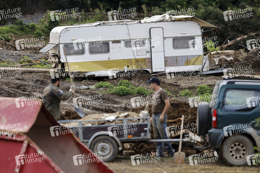 Nach dem Jahrhunderthochwasser in der Eifel durch heftige Regenfälle und Dauerregen mit Überschwemmungen und Überflutungen haben die Aufräumarbeiten im Ahrtal große Fortschritte gemacht. Einheiten von Polizei, THW, Bundeswehr und Feuerwehr mitsamt vielen freiwilligen Helfern haben Straßen geräumt, Schutt und Schlamm entfernt und die Menschen versorgt. Der Wiederaufbau wird trotzdem Jahre dauern. Im Bild Flutschäden in der Ortschaft Mayschoß, in der die Flut viele Häuser zerstörte, 08.08.2021