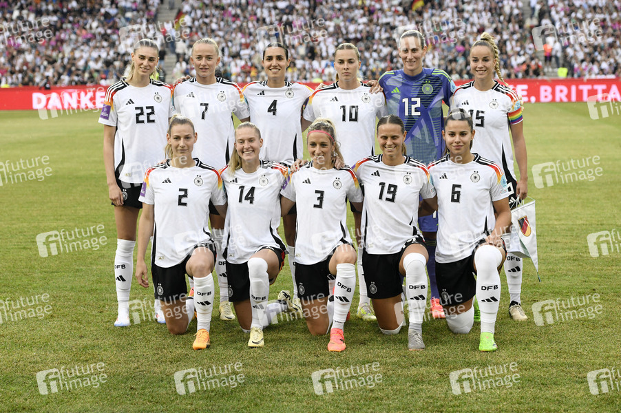Jule Brand (22), Sarai Linder (2), Lea Schüller (7), Janina Minge (14), Bibiane Schulze Solano (4), Kathrin Hendrich (3), Laura Freigang (10), Klara Bühl (19), Ann-Katrin Berger (12), Lena Oberdorf (6) und Giulia Gwinn (15) beim Frauenfußball EM-Qualifikationsspiel Deutschland gegen Österreich (4:0) in der Heinz-von-Heiden-Arena. Hannover, 16.07.2024