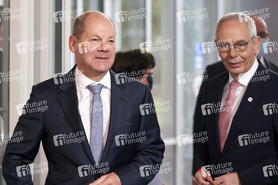Olaf Scholz und Michael Vassiliadis beim 7. Ordentlichen Gewerkschaftskongress der IG Bergbau, Chemie, Energie im Hannover Congress Centrum. Hannover, 27.10.2021