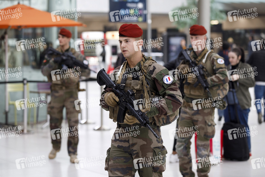 Soldaten bewachen während der Gelbwesten-Proteste auf Geheiß von Präsident Macron öffentliche Gebäude. Im Bild Soldaten am Bahnhof Gare du Nord. Paris, 23.03.2019